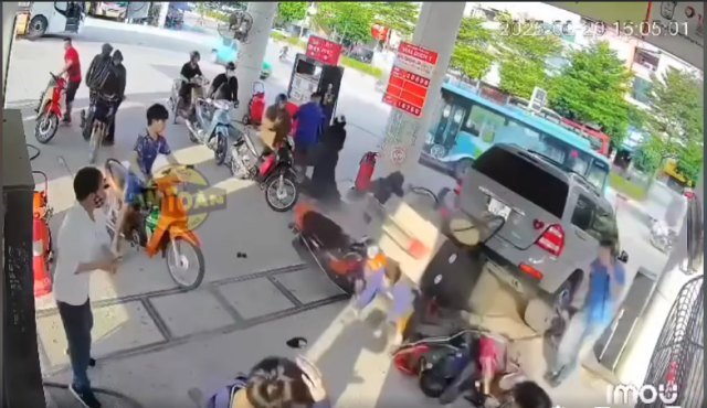 Đoạn camera an ninh ghi lại được cảnh chiếc ô tô đi lùi rồi húc thẳng vào trụ bơm xăng, khiến lửa bùng lên dữ dội. Một nhân viên cây xăng bị kẹt giữa xe máy và cây xăng vô cùng nguy hiểm.