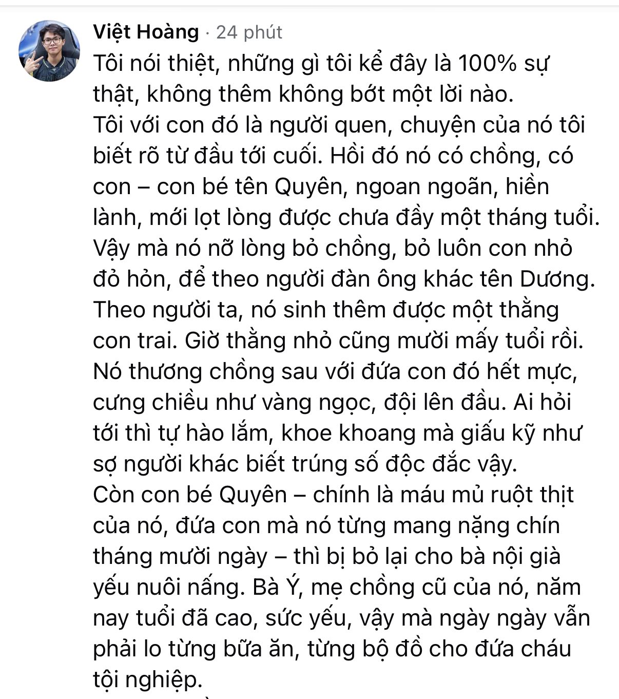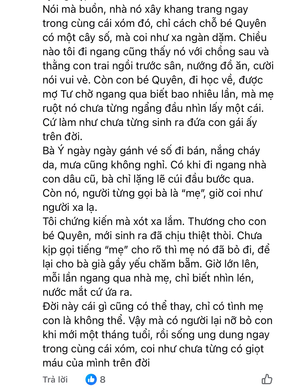Quyên thương bà hơn bất cứ điều gì. Em sợ nhìn thấy cảnh bà lén lau nước mắt, sợ nghe tiếng ho khan trong đêm, sợ một ngày bà ngã bệnh, không còn đủ sức đi bán. Mỗi bữa ăn, bà luôn nhường phần ngon cho cháu, còn mình chỉ chan nước mắm với cơm nguội. Biết bà cực khổ, Quyên giấu bà chuyện mình không ăn sáng để tiết kiệm tiền. Có hôm, em chỉ ăn mì gói thay cơm, bữa trưa không có bà ở nhà thì ăn cơm chan nước tương. Vì thiếu chất, em bị thiếu máu, thường xuyên đau đầu, chóng mặt nhưng vẫn im lặng chịu đựng, không dám nói, sợ bà lo.
