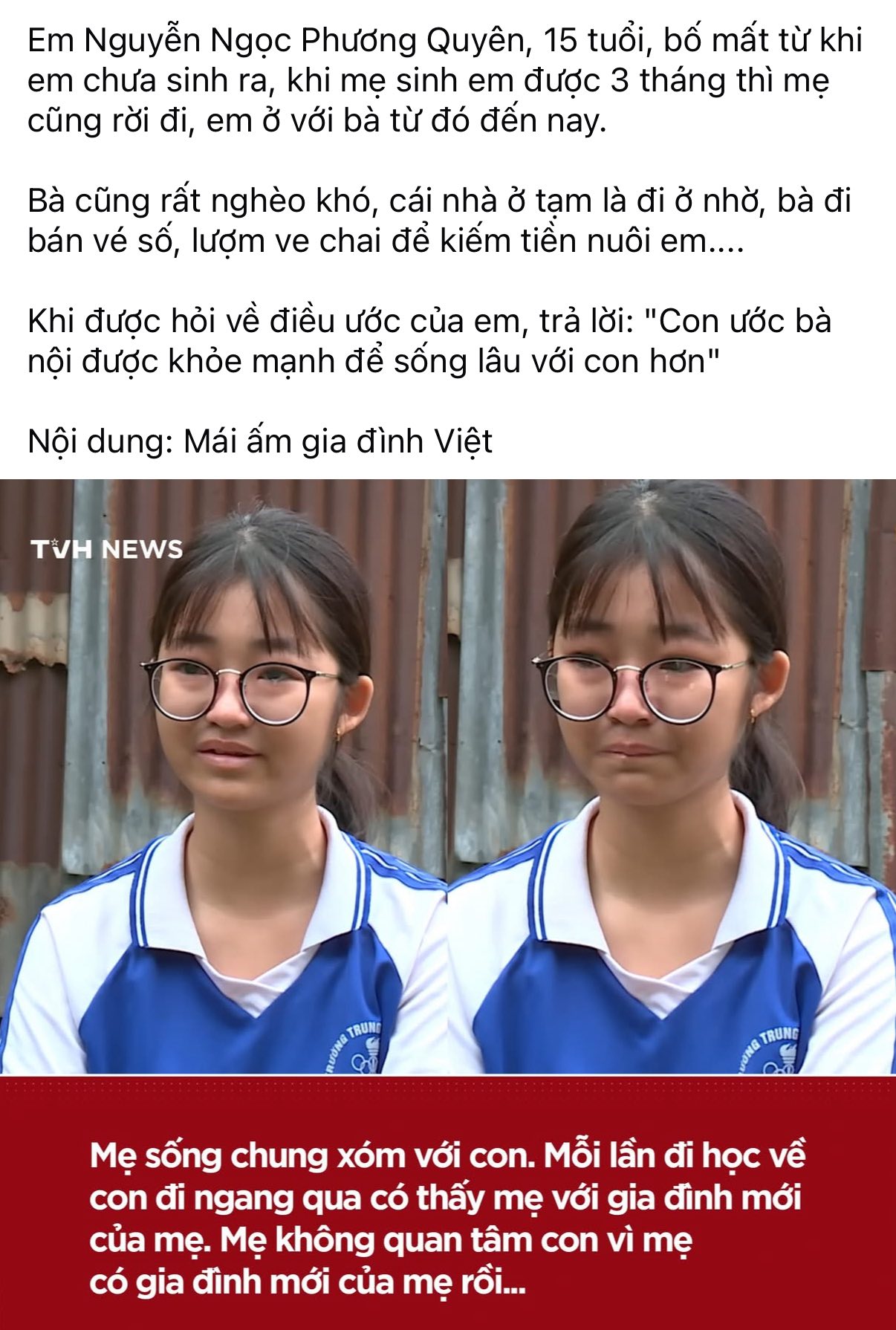 Em Nguyễn Ngọc Phương Quyên, 15 tuổi, hiện là học sinh Trường THCS Thị trấn Tri Tôn, huyện Tri Tôn, tỉnh An Giang. Cuộc đời em bắt đầu bằng những mất mát không lời. Cha mất chỉ 27 ngày trước khi em cất tiếng khóc chào đời, còn mẹ bỏ đi khi Quyên mới tròn 3 tháng tuổi, không một lần ngoái lại, cũng chẳng để lại tin tức gì.
