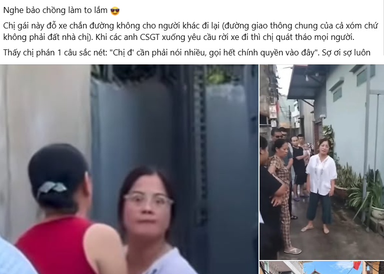 Chị gái này đỗ xe chắn đường không cho người khác đi lại (đường giao thông chung của cả xóm chứ không phải đất nhà chị). Khi các anh CSGT xuống yêu cầu rời xe đi thì chị quát tháo mọi người.