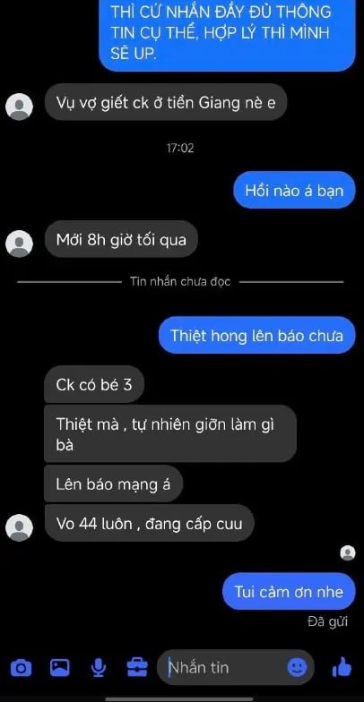 Theo thông tin ban đầu, tối 21/4, ông Lê Hoàng Hải (SN 1974) và vợ là bà Trần Thị Thanh Tuyết (SN 1974, cùng ngụ xã Tân Hòa) xảy ra mâu thuẫn nghi do ghen tuông tình ái. Trong lúc xô xát nghi đối tượng đã dùng cây búa cán bằng gỗ, đầu bằng kim loại đánh chồng dẫn đến tử vong. Còn bà Tuyết cũng bị thương được người thân đưa đến Bệnh viện Đa khoa khu vực Gò Công điều trị.