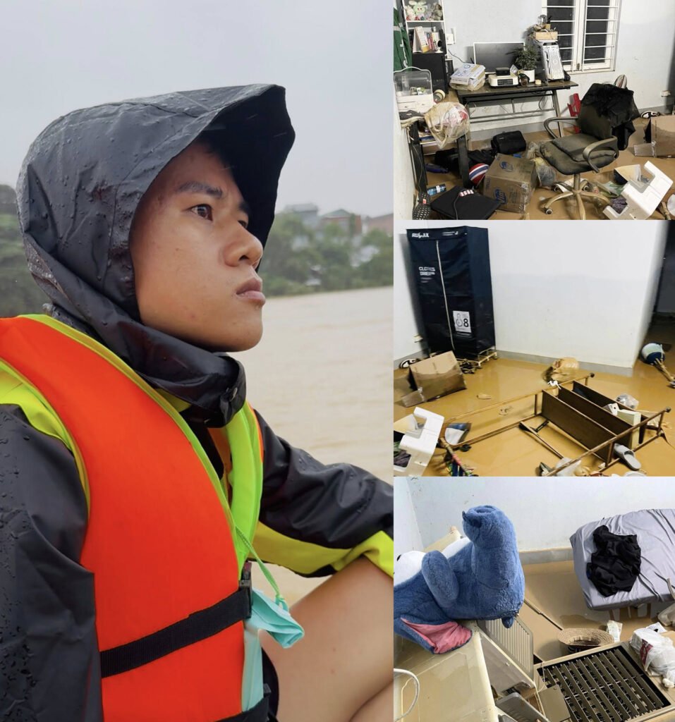 Những bức ảnh được chia sẻ cho thấy cảnh phòng trọ ngập bùn đất, đồ đạc ngổn ngang, máy tính, bàn làm việc, thiết bị điện tử đều hư hại nặng. Cùng lúc đó, người ta vẫn thấy hình ảnh anh Huỳnh trên chiếc cano đỏ, dầm mình trong mưa lũ, trao từng suất quà cho bà con vùng ngập sâu những hình ảnh khiến cộng đồng mạng không khỏi xúc động.
